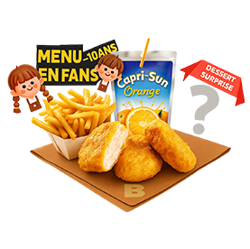 4 Nuggets ou 4 mozza sticks + Frites + Sauce (ketchup /mayonnaise) + 1 kinder surprise + 1 Capri sun.
