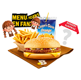 Cheese burger + Frites + 1 kinder surprise + 1 Capri sun.
