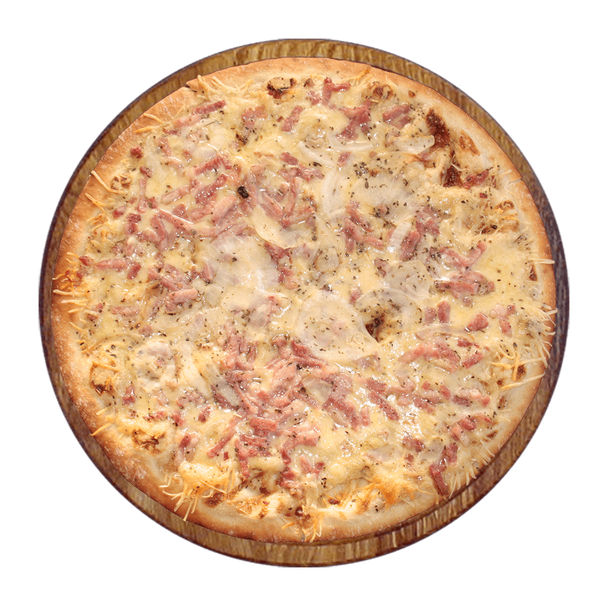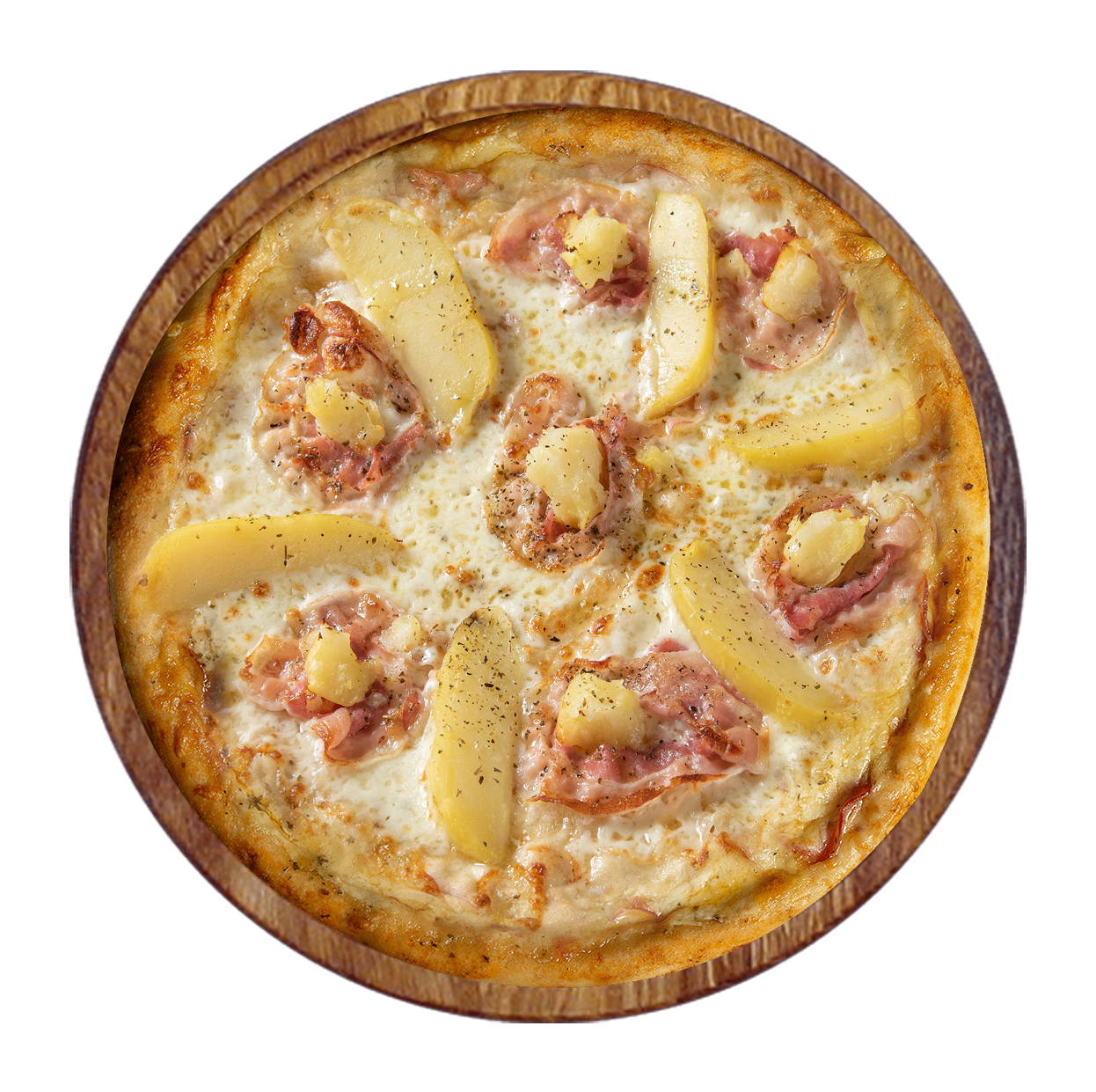 Crème fraîche, mozzarella, lardons, pommes de terre, oignons.