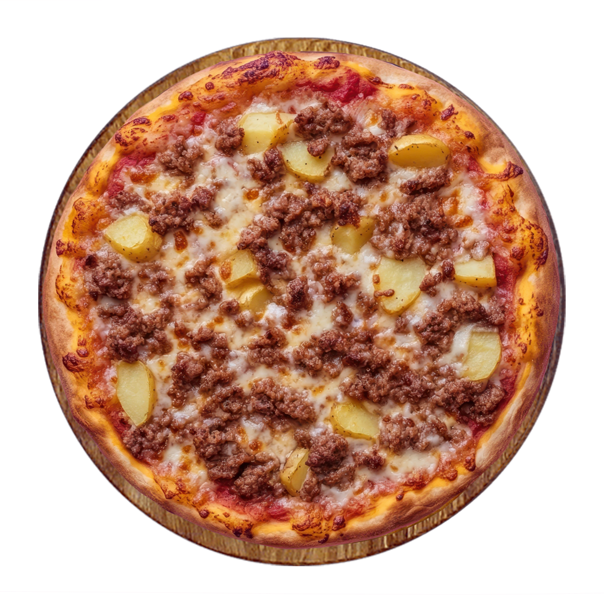 Crème fraîche, mozzarella, viande hachée, oignons, pommes de terre.