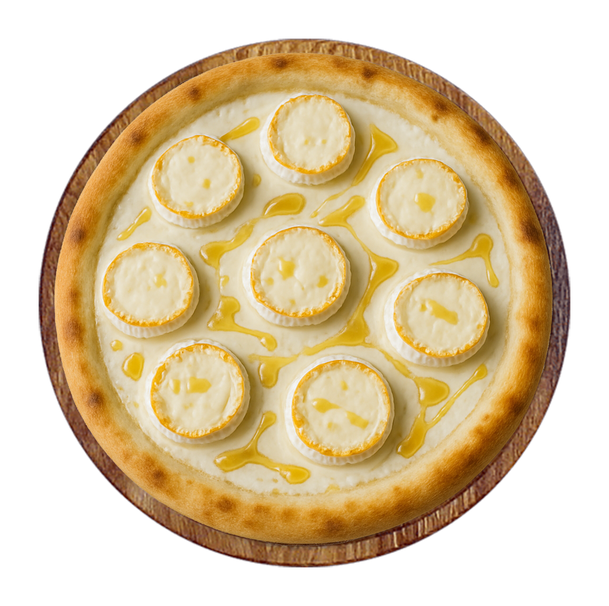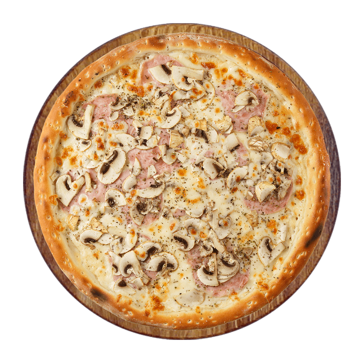 Crème fraîche, mozzarella, raclette, jambon, champignons, olives.