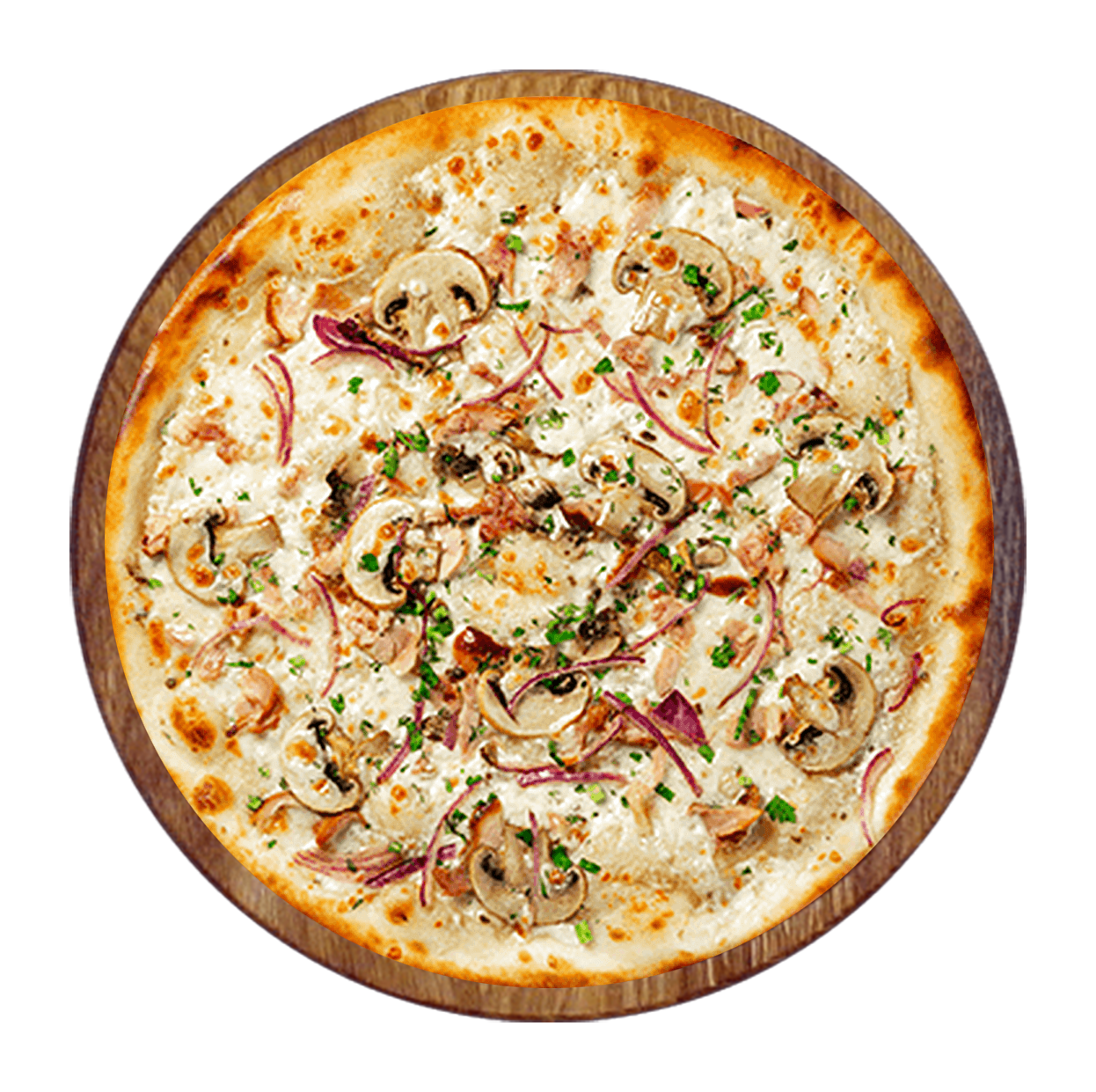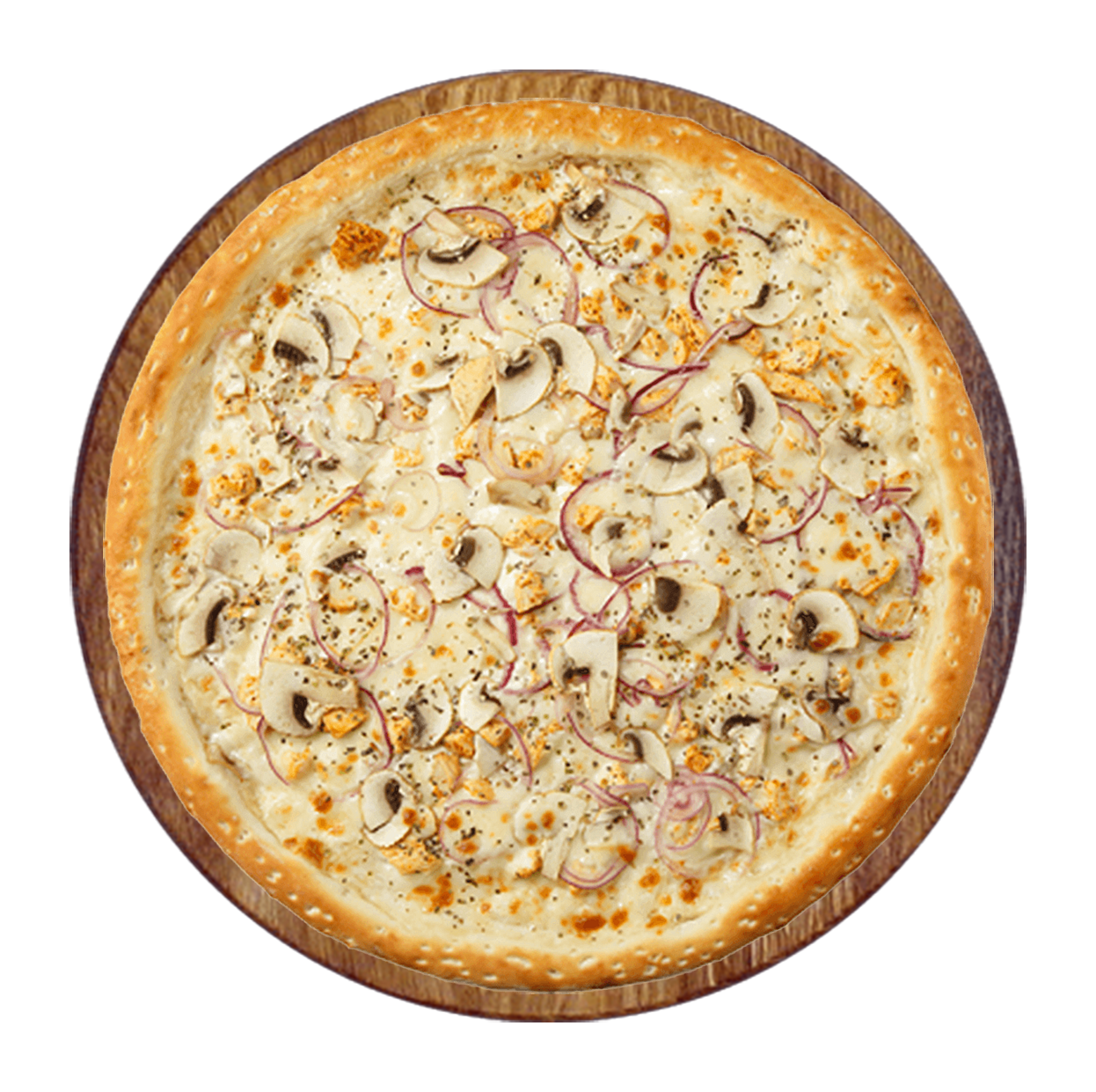 Crème fraîche, mozzarella, double poulet, champignons, oignons.