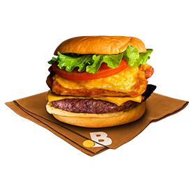 Smashed beef, cheddar, bacon, salade, tomates, oignons, cornichons, sauce maison.